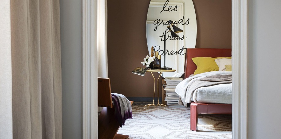 而略呈錐形的帶襯墊床頭板則由中央縫線定義,採用優質皮革和獸皮裝飾經過特殊鞣製處理,使其特別柔軟舒適
