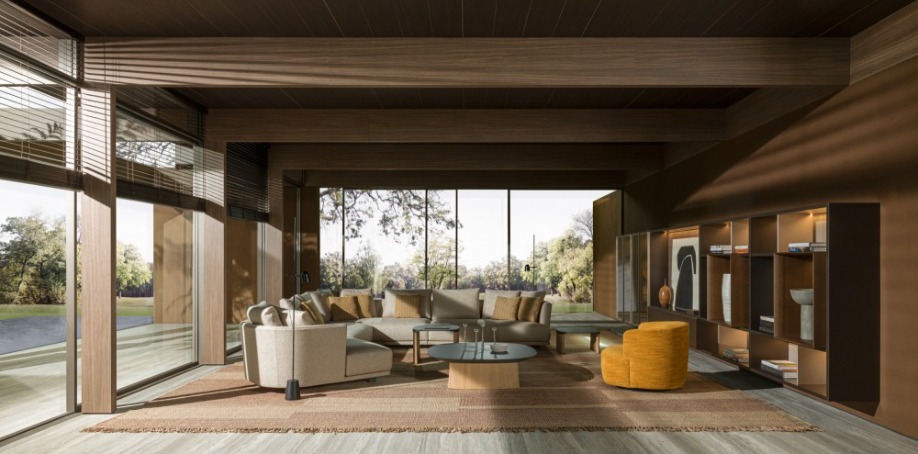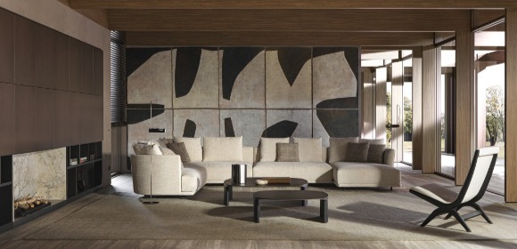 沙發腳由黑漆鋼所打造,旨在使沙發看起來像漂浮在起居區的物體,從而成為心臟和主角,因為即使在房間的中央,它也能輕鬆搭配