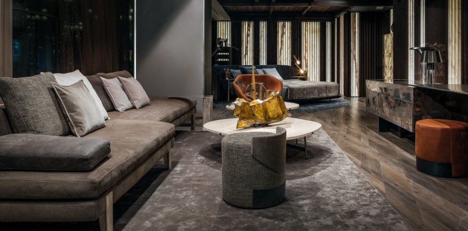 沙發整體坐落在優雅和標誌性的黃銅支腳上, 以強烈又活力的裝飾來強調聚合敘事的輕盈