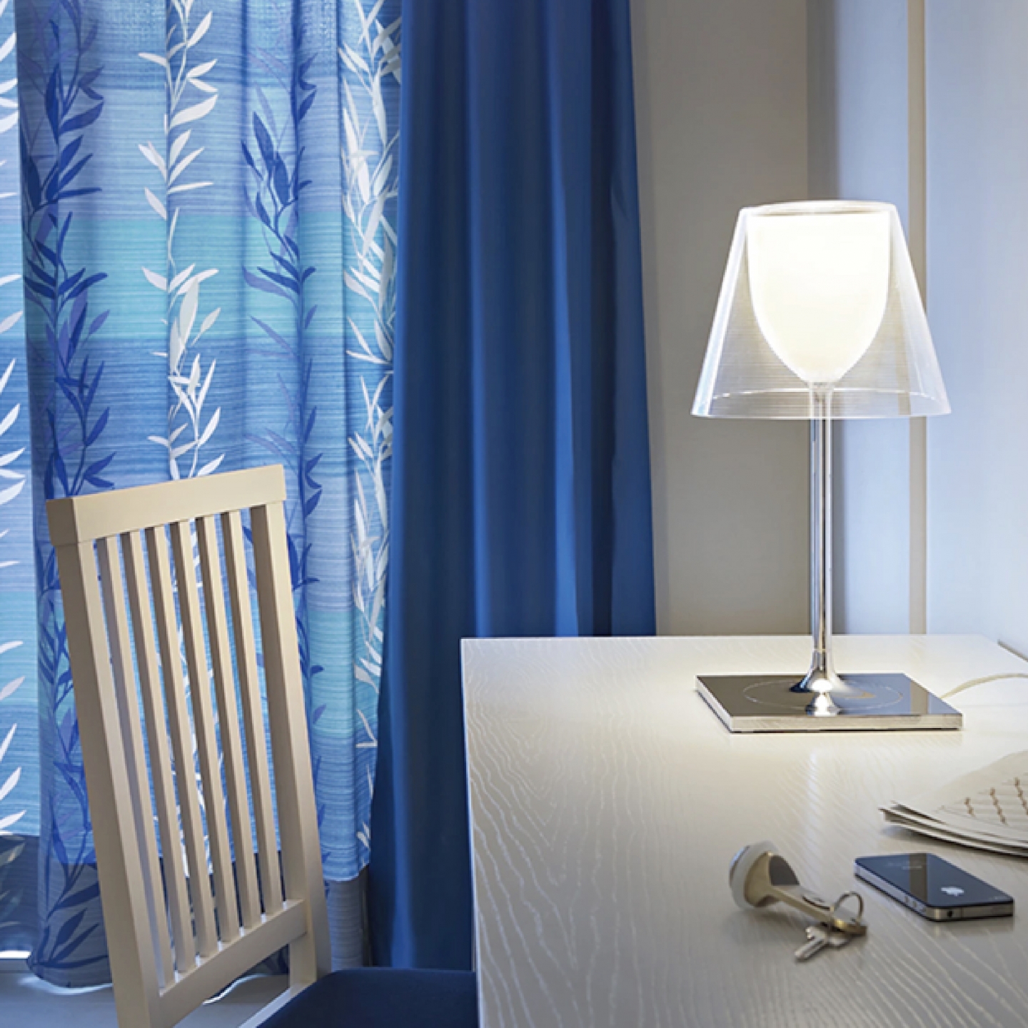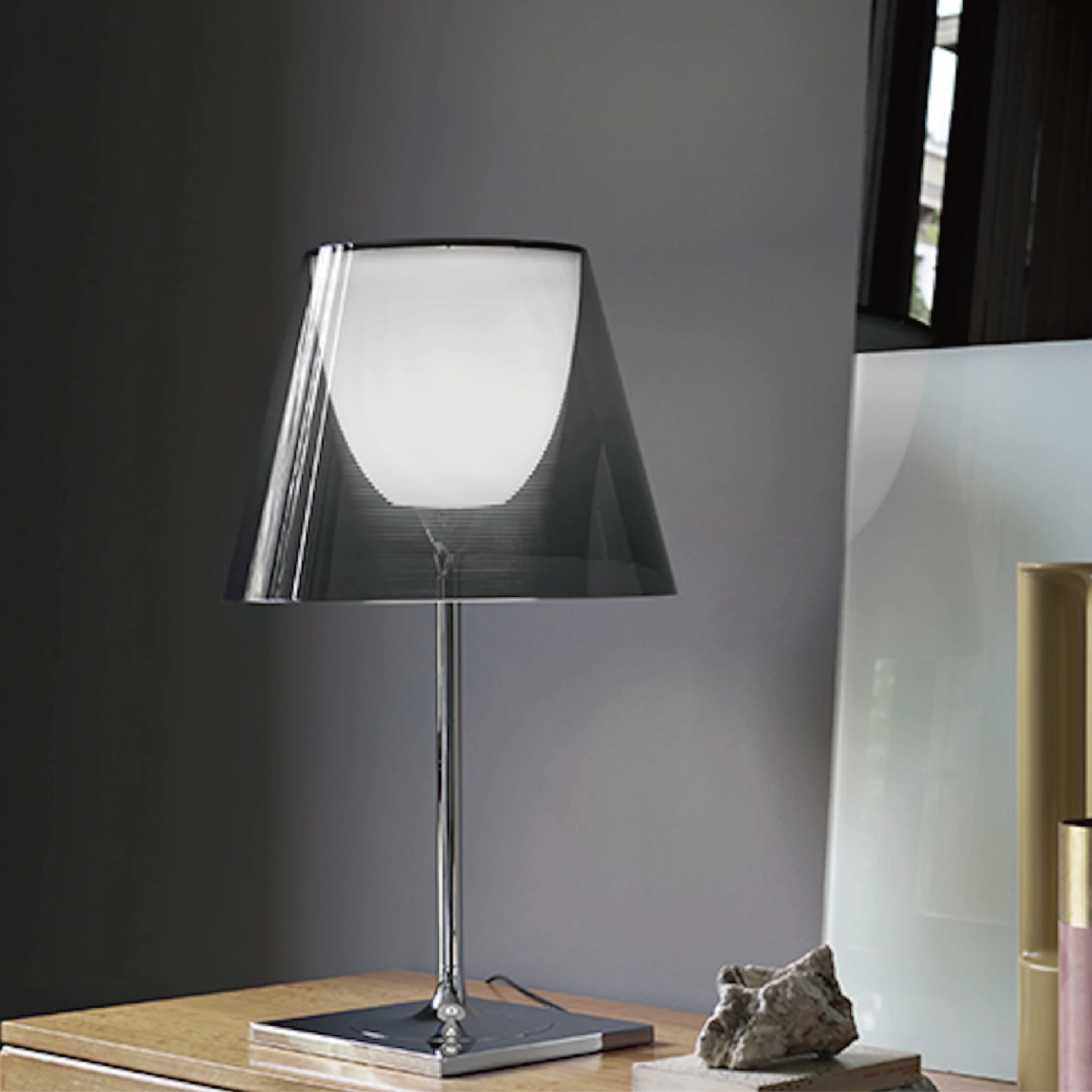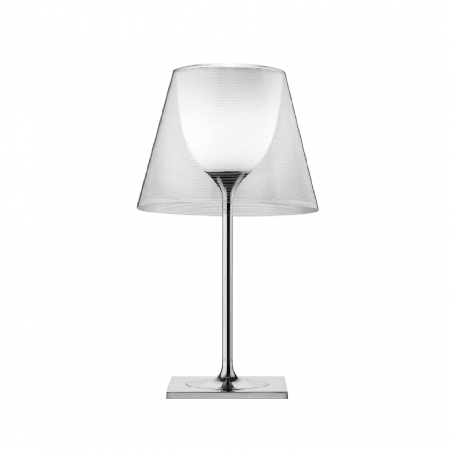 Flos Ktribe 系列是出自法國設計大師 Philippe Starck 菲利浦 史塔克的作品之一,以古典優雅的平衡美學,透明燈罩為耐熱塑料,內層真空電鍍的奢華光澤,跨越多重的空間表情,有著美麗的間接照明,關燈時,呈現外部燈罩的特色。開燈時,光源由內而外透出,讓光線更加柔和勻稱,表現出層次美學的優雅光感。